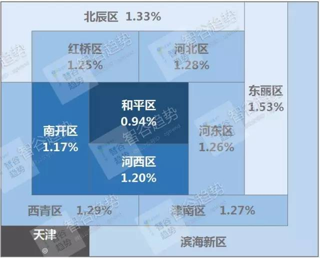 天津市中心——和平区的租金回报率着实是所有区中最低的,而且越往外围租金回报率越高。和平区是天津房价最高的地区。此外,作为临近北京的大都市,京津高铁使得在北京上班、在天津安家成为可能,因此也超热了高铁站周边的房价。