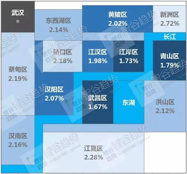 武汉沿长江的几个区:汉江、江岸、武昌、汉阳、黄坡的租金回报率都比较低,其中武昌区的平均房价是最高的。