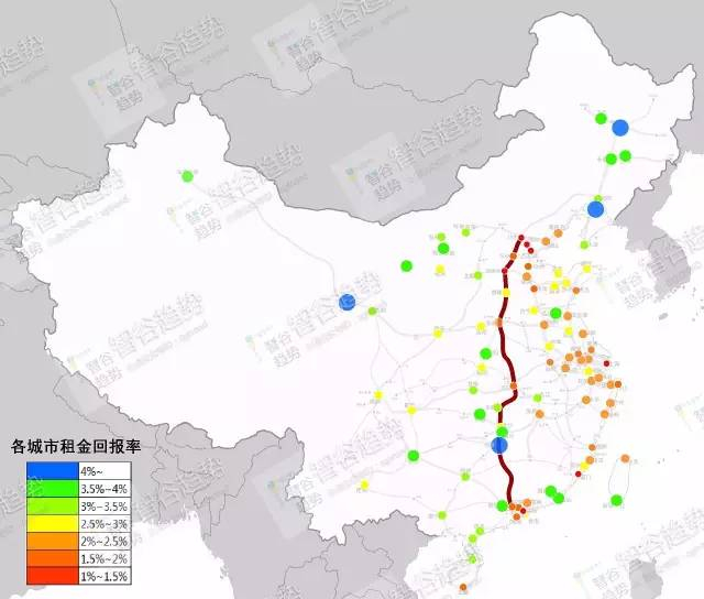 此外从上图来看,越往东部沿海地区的城市,租金回报率越低,呈现梯级递减。