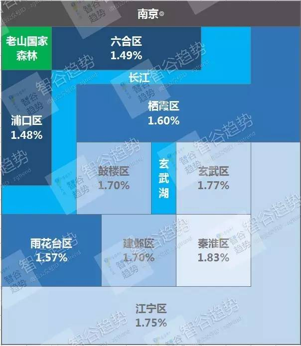 ⑥ 南京:呈西北低东南高的“一面倒分布”特点,越市中心租金回报率越高。