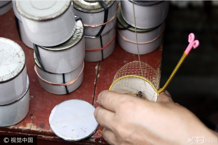 工厂内,大小不一的罐子整齐码放在架子上等待入窑烧制。火窑入口处,工作人员正逐一排放上了釉的罐子。“两个小时后出来的就是雪白的陶瓷罐了。”工作人员说,这些大小不一的罐子都是用来盛放蟋蟀的,在烧制好的陶瓷罐底部铺一层当地的泥土,便可以将蟋蟀临时养在里面。