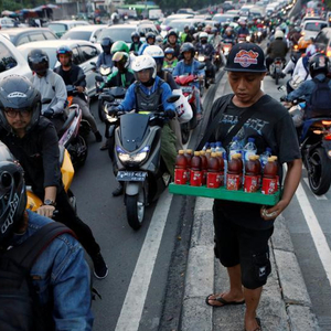 雅加达在高峰时段公路拥堵不堪,小贩趁机穿梭其间兜售汽水。