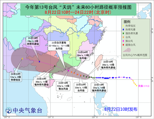 台风“天鸽”路径概率预报图(8月22日10时至24日22时)