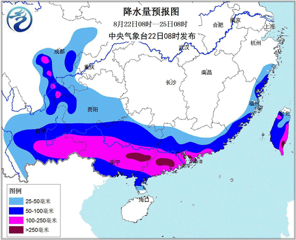 台风“天鸽”降水量预报图(8月22日08时至25日08时)