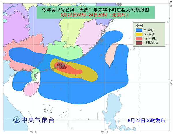 台风“天鸽”大风预报图(8月22日08时至24日20时)
