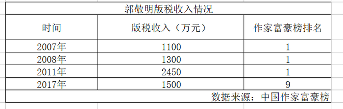 每经小编(微信号:nbdnews)了解到,今年4月发布的2017年作家富豪榜上,自2014年就未出书的郭敬明,依然以1500万元的版税收入位居第九名。而公开资料显示,在2007年、2008年、2011年,郭敬明分别以1100万、1300万、2450万元的版税收入在当年排行榜上位居第一。