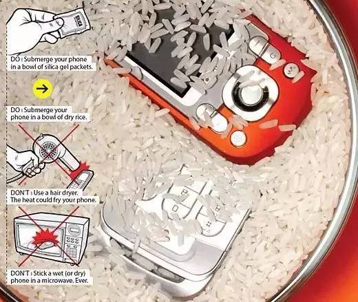 第三步:拯救进水手机接下来,就要对进水手机进行抢救啦,如果泡在水里的时间不长,这时可以有两种方法,自己在家就可以操作,去除手机中的水分,就能正常开机了!
