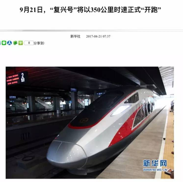 不过,目前乘坐“复兴号”的京津城际旅客,并不能实际体验到每小时350公里的运行速度。还需要再等一个月,“复兴号”才能按照这一时速运行:
