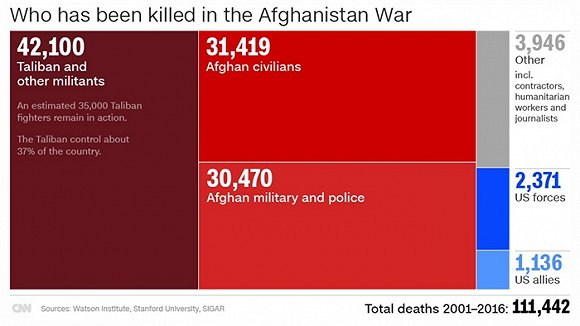 根据CNN的统计,截至目前,阿富汗战争已经花费了美国至少8410亿美元。如果再加上给退伍老兵的补贴和其他后续费用,这个数字将超过1万亿美元。