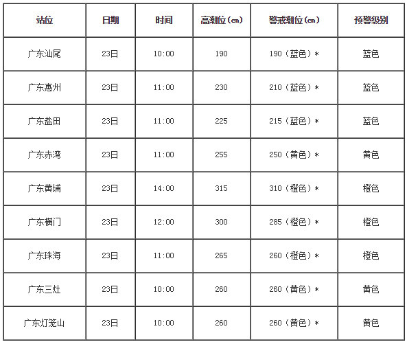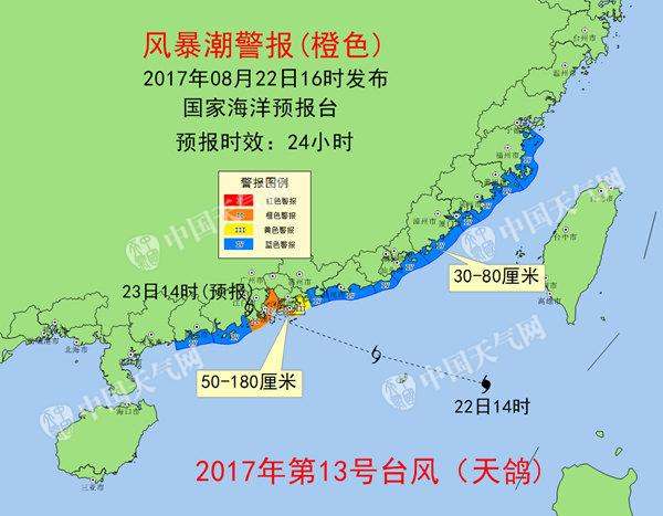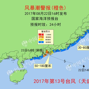 中国天气网讯 受今年第13号台风“天鸽”的影响,预计:8月22日下午到23日下午,福建闽江口到漳州沿海将出现30到80厘米的风暴增水,广东汕头到阳江沿海将出现50到180厘米的风暴增水。上述岸段内的广东黄埔、横门和珠海潮位站将于23日中午前后出现达到当地橙色警戒潮位的高潮位;赤湾、三灶和灯笼山潮位站将于23日中午前后出现达到当地黄色警戒潮位的高潮位;汕尾、惠州和盐田潮位站将于23日中午前后出现达到当地蓝色警戒潮位的高潮位。广东省广州市、东莞市、中山市和珠海市的风暴潮预警级别为橙色,深圳市的风暴潮预警级别为黄色,惠州市和汕尾市的风暴潮预警级别为蓝色。