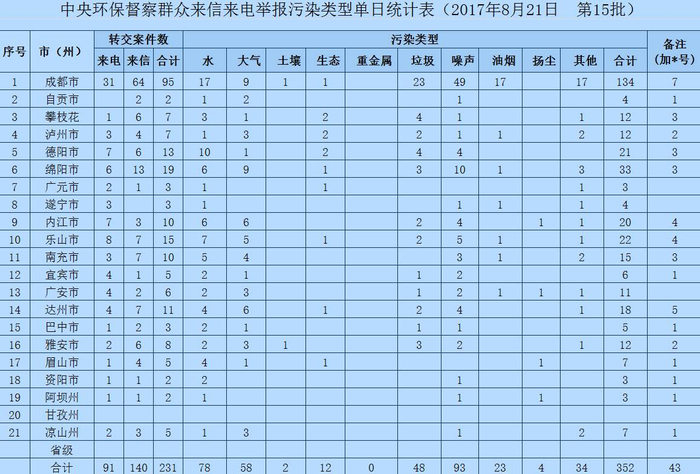 今天,中央环境保护督察组交办我省第15批群众来电来信举报件,共计230件(来电90件、来信140件)。其中成都95件、自贡2件、攀枝花7件、泸州7件、德阳13件、绵阳19件、广元3件、遂宁3件、内江10件、乐山15件、南充10件、眉山5件、宜宾5件、广安6件、达州11件、雅安8件、巴中3件、资阳2件、阿坝2件、凉山5件。
