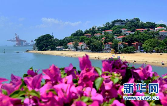 这是三角梅掩映下的鼓浪屿海边沙滩(8月5日摄)。三角梅是厦门的市花。新华社记者 魏培全摄