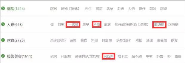 “客语认证词汇数据库”官方网站所有分类下的客家词汇(红字部分为日语词汇)