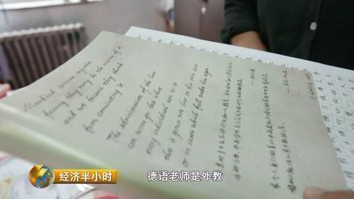 田艳芹:这个是上大学写的德语,她的书写老是一等奖,写得非常好,德语老师都跟我说你的孩子很优秀。