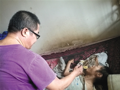 8月20日,崔建国在顺义区的家里给患有亨廷顿舞蹈症(HD)的妻子韩爱华喂饭。 新京报记者赵蕾 实习生赵今朝 摄