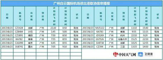 广州白云机场取消进出港航班48班