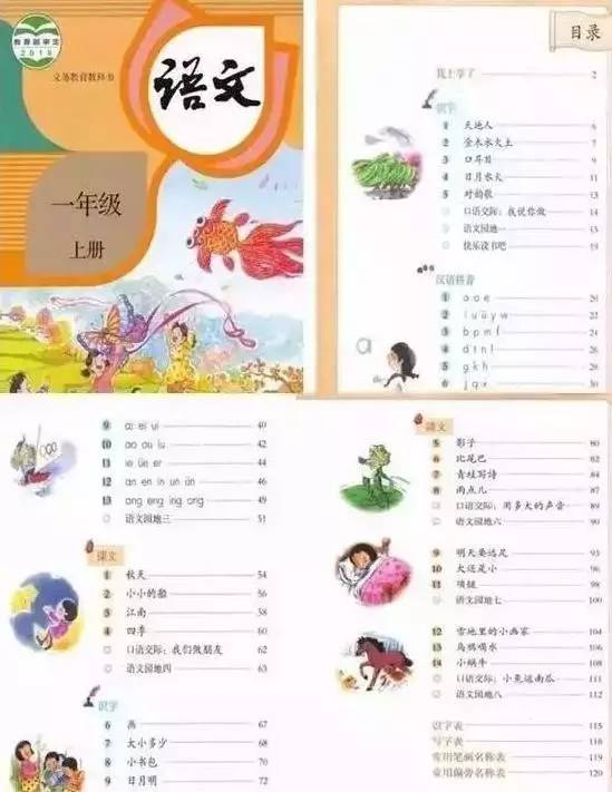 一年级上册语文教材共安排了2个识字单元、2个汉语拼音单元和4个课文单元。让孩子们在学习了"天地人"、"口耳目"、"金木水火土"等一些常用字之后,再进行13个课时的汉语拼音系统学习。
