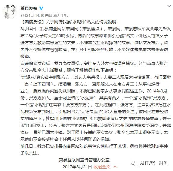 最开始,这段视频被人配上“女子为救患癌丈夫每天扛水泥”的标题在网络传播,随后,安徽萧县官方发布了一则通告,证实张方方的丈夫并非罹患癌症,而是肺部感染。