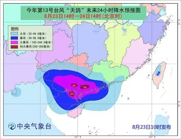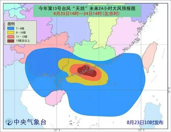 大风预报:8月23日14时至8月24日14时,南海北部、台湾海峡、琼州海峡、北部湾以及广东沿海、福建南部沿海、海南东部和北部沿海、广西沿海以及广东南部和广西东部地区将有7-10级大风,珠江口附近地区将有11-13级大风,“天鸽”中心经过的附近海域或地区的风力有14-15级大风,阵风可达16-17级。