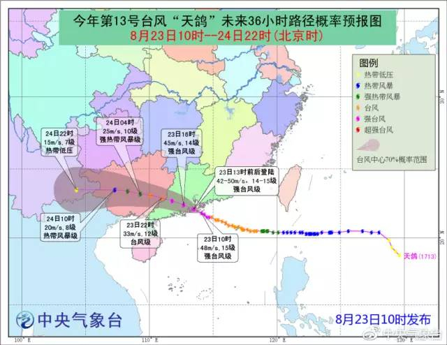 预计,“天鸽”将以每小时25公里左右的速度向西偏北方向移动,今天中午1点前后在广东珠海到台山一带沿海登陆(42-50米/秒,14-15级,强台风级),登陆后继续向偏西方向移动,强度逐渐减弱,23日晚上将移入广西境内(30-35米/秒,11-12级,强热带风暴级或台风级)。