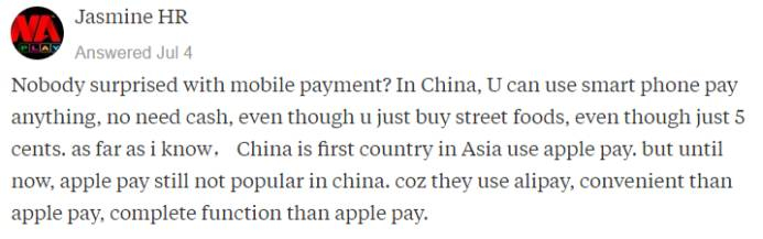 没人对移动支付感到震惊吗?在中国,你只要有手机就能买任何东西,完全不用现金,就算是买路边摊,就算只是要付半毛钱都能用手机。中国是亚洲最早开通苹果支付的国家,然而苹果支付在中国还是没普及。因为中国的支付宝实在是太方便了,功能还比苹果支付强大。