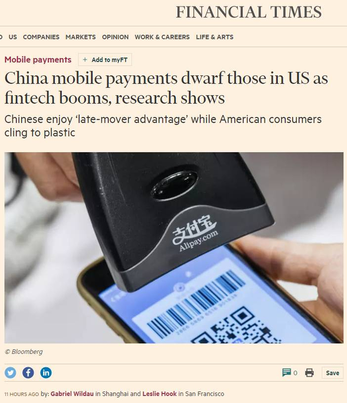 今年2月,英国的《金融时报》发表了一篇题为《相比于中国,美国的移动支付市场看上去像是侏儒》的文章。
