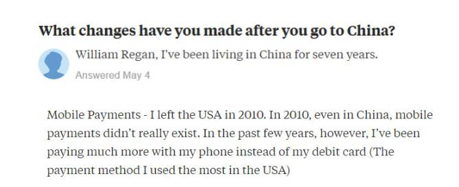 移动支付——我2010年离开美国。2010年中国移动支付还不存在,但在过去的几年里,我已经变得抛弃借记卡(我在美国一直用)改用移动支付了。