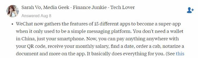 微信虽然是通讯应用起步,但现在已经将15款应用的功能集于一身,十分强大。在中国你完全不需要钱包,有手机就够了。只要扫码就能随时随地买到任何东西,你可以查工资、交友、叫车、传文件,什么都能做。