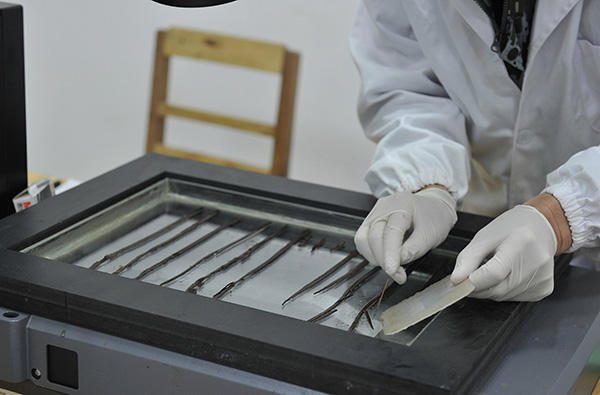 ↑文物保护人员通过红外扫描,对竹简上的文字进行辨识。视觉中国 资料