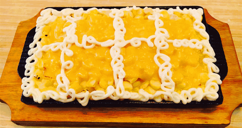 3.用小火将锅内的玉米粒煎至定型,晃动锅子是一整块移动的。这时再将事先烧过的油慢慢沿着锅边淋入。