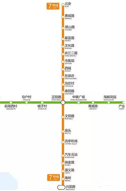 起点站为朝阳村站,终点站为金沙滩站,全程共21站。天目山路站可与1号线换乘,太行山路站可与13号线换乘,嘉陵江路站和中德生态园站可与6号线换乘,红岛火车站站可与8号线换乘。