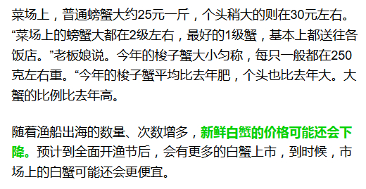 不过,这样低廉的价格并不会是常态。据路林市场的负责人介绍:“路林市场白蟹销售维持在每天60吨左右。10月以后,天气逐渐变凉,鲜白蟹的供应量会降低;再加上水产商会把一部分品质好的鲜白蟹拉入冷库,供应春节期间销售,进一步减少了市场货源。鲜白蟹的价格又会一步步涨上来了。”