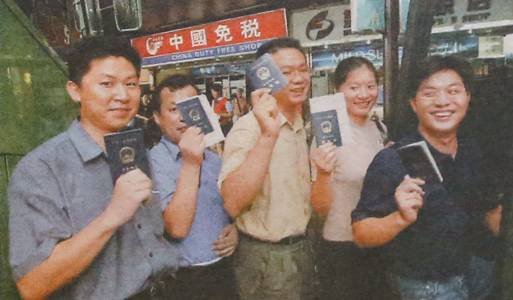 2003年8月25日下午一时许,广东省电信有限公司深圳分公司增值业务部总经理王亮手持崭新的个人港澳游通行证,来到皇岗口岸旅客出境大厅,经过30秒查验证件,王亮成为深圳首个持个人港澳通行证前往香港的深圳市市民。图为王亮(右一)和首批持证旅客心情愉快地登上开往香港九龙的大巴。