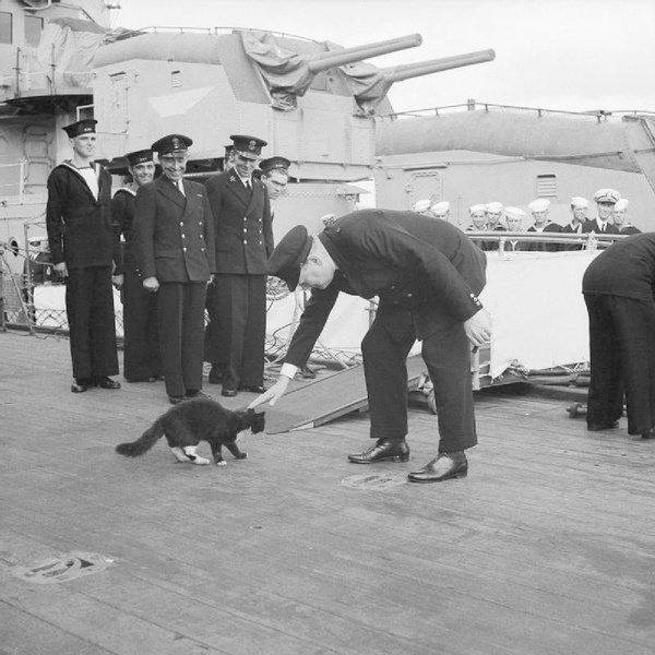 至于二战,最著名的猫便是威尔士亲王号上的Blackie了。1941年,威尔士亲王号战舰载着英国首相丘吉尔跨越大西洋,抵达纽芬兰。在那里他将与美国总统罗斯福秘密会见。在要下船时,威尔士亲王号的船猫Blackie靠近丘吉尔,似乎是要与他道别。丘吉尔弯下腰去摸了摸猫咪的头。这张照片被记者捕捉下来。托猫咪的福,与美国总统的会面很顺利,英美共同签署了著名的《大西洋宪章》。之后这只猫被改名为“丘吉尔”。
