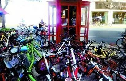 一座公用电话亭被共享单车包围