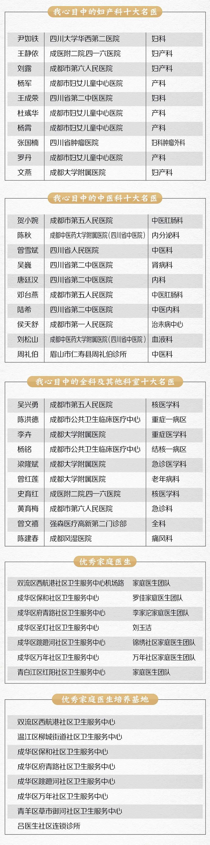 20日的颁奖典礼上,“我心目中的名医十大名医”、“我心目中的十大人气名医”、“我心目中的名医(科室)”、“优秀家庭医生”以及“优秀家庭医生培养基地”等13个的获奖名单正式公布,上百名医生、单位榜上有名。