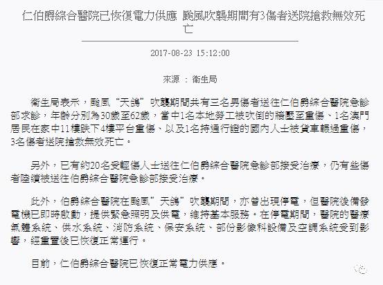 据澳门新闻局消息,台风“天鸽”吹袭期间共有三名男伤者送往医院治疗,均抢救无效死亡。