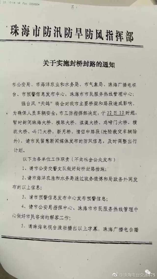 22日下午开始,珠海公安交警部门处于一级戒备状态,全部警力投入路上一线守护。23日上午,珠海市三防指挥部发布防台风紧急动员令,并封锁所有桥梁及市内多个危险路段。公共汽车全部停运,珠海机场航班全部取消。