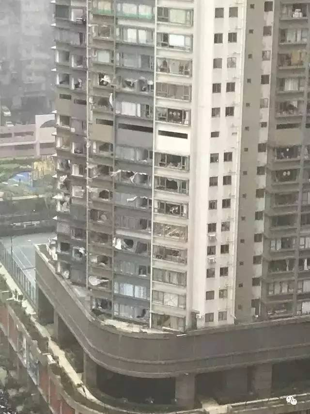 居民楼受台风影响,玻璃被强风吹落,满目疮痍。