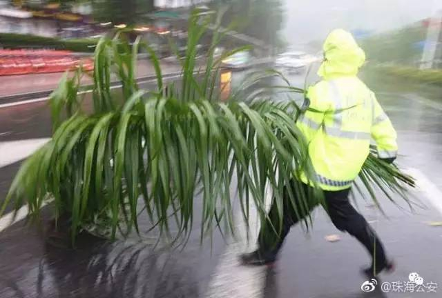 珠海市民警与交警在台风入境后清理道路,疏导交通