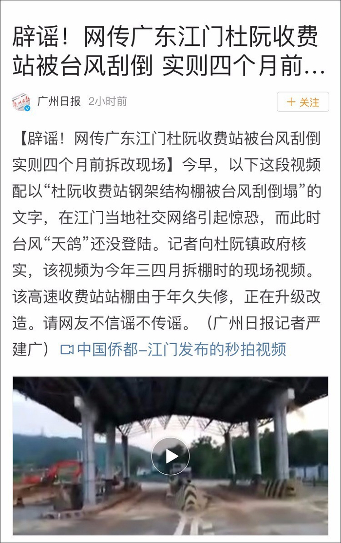 关注台风威力的同时,媒体也打掉了关于“天鸽”的第一个谣言。