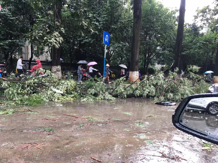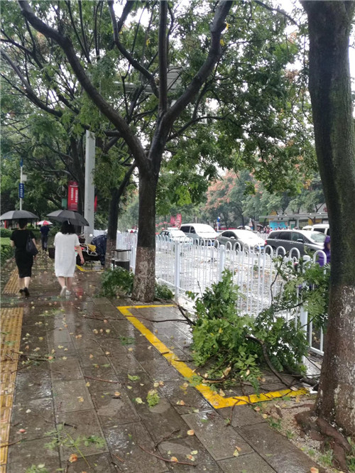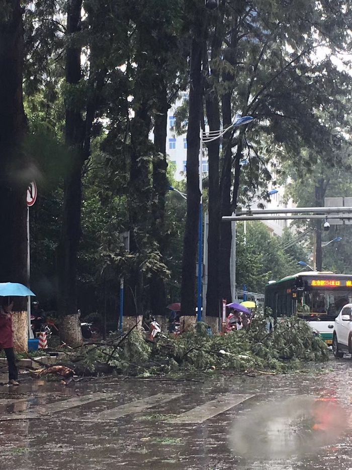 突如其来的暴雨造成翠湖环路树枝折断、树木倒下,现场无人员伤亡。华山街道办事处工作人员第一时间赶到现场进行处置,将折断的树枝挪到路边,目前翠湖环路交通已基本恢复畅通。