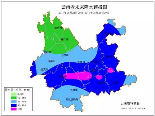 24日至25日我省自东向西将出现强降雨过程;其中,滇中及以东以南、滇西有大到暴雨局部大暴雨,过程累积雨量为50~120毫米,局地可达200~250毫米。