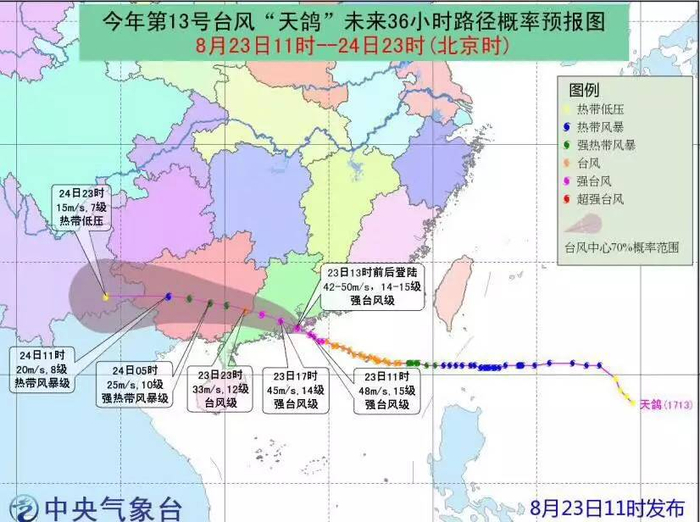 预计今年第13号台风“天鸽”于23日中午前后在广东珠海到阳江一带沿海登陆,登陆后向西移动、强度逐渐减弱为热带低压。