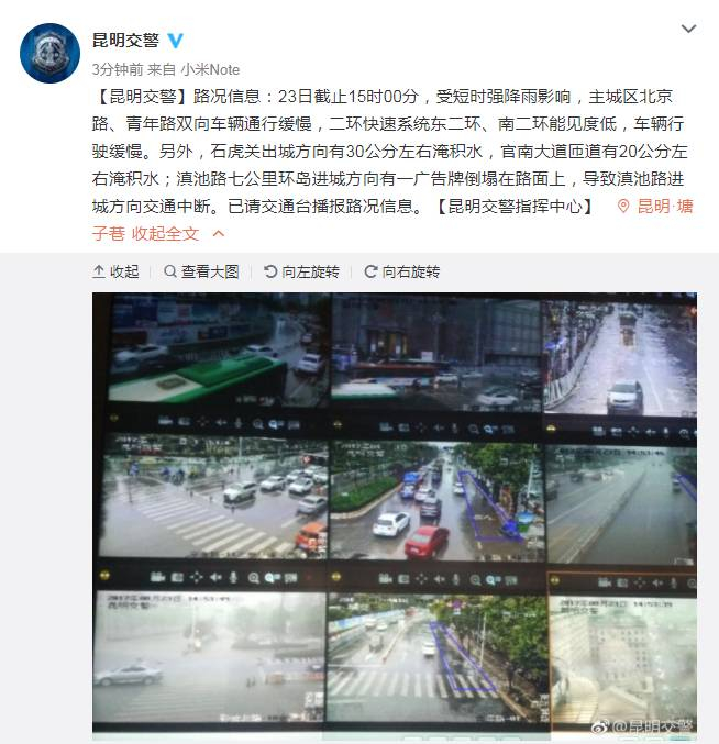 受短时强降雨影响,主城区北京路、青年路双向车辆通行缓慢,二环快速系统东二环、南二环能见度低,车辆行驶缓慢。另外,石虎关出城方向有30公分左右淹积水,官南大道匝道有20公分左右淹积水;滇池路七公里环岛进城方向有一广告牌倒塌在路面上,导致滇池路进城方向交通中断。