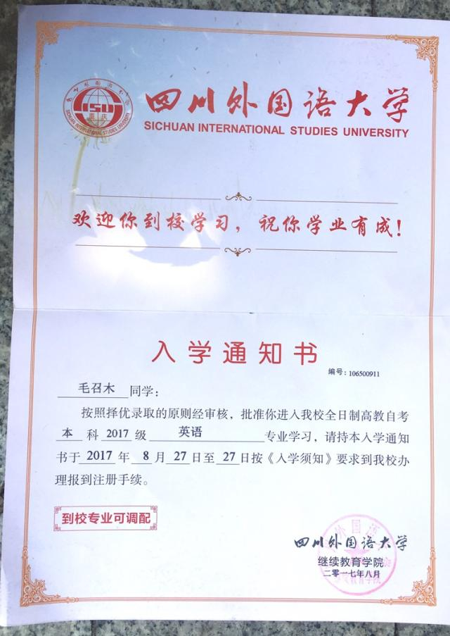 川外成人自考本科的申请时间是7月下旬。8月中旬,他如愿收到了川外继续教育学院发来的录取通知书,本月底就将报名入学。