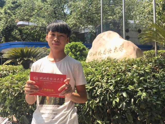 毛召木拿着录取通知书在四川外国语大学校门口合影留念。新华社记者柯高阳8月22日摄。想做同声传译,他用另一种方式圆了大学梦