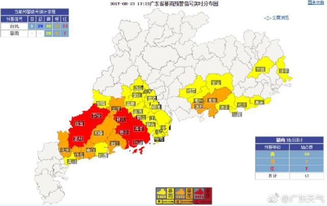 23日夜间,粤西市县有暴雨到大暴雨,珠江三角洲有暴雨局部大暴雨,其余市县有大雨局部暴雨。