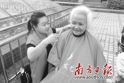 惠城区的志愿者进社区帮老人理发。南方日报记者 王昌辉 摄 |