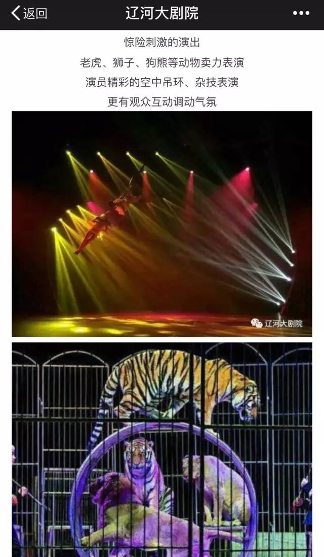 记者查询了该剧院的微信号,马戏团来的时候进行了宣传。老虎、狮子……卖力表演。